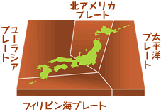 日本のまわりには、北アメリカプレート、ユーラシアプレート、太平洋プレート、フィリピン海プレートという、4つのプレートがある。この4つのプレートはぶつかりあって、海のプレートは陸のプレートの下にもぐりこんで少しずつ動いている。プレートはそれぞれ複雑(ふくざつ)な動きをしているから、日本は特に地震が多いんだ。今まで起きた地震を見ても、プレートの境目(さかいめ)で大きな地震が起きていることがわかるよ。