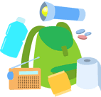 地震に備えて、持ち出し品を用意しておくことも大切だ。食べ物や飲み物のほか、お金や通帳などの貴重品(きちょうひん)も欠かせない。懐中電灯(かいちゅうでんとう)、携帯(けいたい)ラジオ、乾電池(かんでんち)は、役に立つからぜひ用意しておこう。他にタオルやトイレットペーパー、薬なども必要だ。あらかじめリュックの中に入れておいて、すぐ取り出せるところに置いておくといいね。