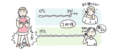 音は空気を波のように揺(ゆ)らしながら耳に伝わってくる。その、音を運ぶ役目をしている空気の温度が変わると、何と音が伝わる速さも変わってくるんだ。