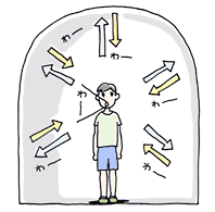 でも、全部の音が触れるとしたら大変。だって音はいつも周りにあるから、ずっとびりびり体に当たってきちゃう。だけど、大丈夫(だいじょうぶ)だよ。音って、いろんな方向に広がって進んでいるものだし、遠くにいくとどんどん小さくなっていくから。