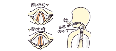 あ~と声を出しながらのどに触(さわ)ってみると、のどは小さく震(ふる)えている。この震えが声の元だ。みんなが息を吐(は)く時空気がのどを通るよね。その時に、のどにある声帯という膜(まく)に空気が当たって震えるんだ。でも、声帯に空気が当たっただけじゃ、まだ声にはならない。舌(した)の形、くちびるの形、あごの開き具合いや鼻(はな)から通る空気などが組み合わさって、出てきた空気の音をいろんな声に変えているんだよ。