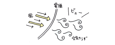 風が強く吹(ふ)いている日って、ビュービューって音がするよね。あれって風の音なんだろうけど、一体どこから聞こえてくるんだろう? それは空気の渦(うず)ができるからなんだ。強く吹いている風は、壁(かべ)とか電線にぶつかった途端(とたん)、割(わ)れちゃうんだ。割れた風は、ぶつかったものの後ろに回り込(こ)んで、ぐるぐると空気の渦を作る。渦は、風が吹いている限(かぎ)り、どんどん生まれては消えていく。そうやって、いくつもできたり消えたりする渦が空気の波を作って音がビュービューって出るんだよ。
