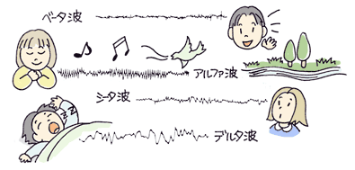 普段(ふだん)生活してる時はベータ波という脳波なんだけど、静かな音楽や鳥の鳴き声、川のせせらぎを聞くとアルファ波という脳波になって、とてもリラックスできる。ほかには、ぼんやりしてる時のシータ波、寝(ね)ている時のデルタ波というのがあるよ。