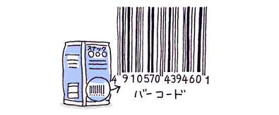 スーパーマーケットやコンビニへ行くと、商品の袋(ふくろ)やシールに黒と白の縦縞(たてじま)マークが付いているよね。これはバーコードっていうんだ。バーコードの縞々(しましま)にはいろんな太さがあって、その組み合わせで、その商品のデータが分かるようになっている。例えば値段(ねだん)、名前、などだね。レジでバーコードを読み取る機械を使えば、すぐに値段や名前が分かるから、素(す)早く間違(まちが)いなく計算できて便利なんだ。