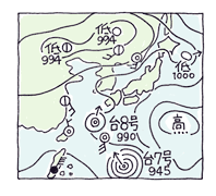 昔の人は空を見上げ、雲の動きを見ながら、雨はどれ位降(ふ)るだろう、どんな風が吹(ふ)くだろう、なんて今までの経験(けいけん)から予想していたんだ。今はそれを機械がやってくれている。陸から、海から、空から、そして宇宙(うちゅう)から雲の動きや空気の変化を見て、予想しているんだよ。機械の中にあるコンピュータには昔から溜(た)めた、たくさんの天気データが詰(つ)まってて、それを基(もと)に未来の天気を予想しているんだね。