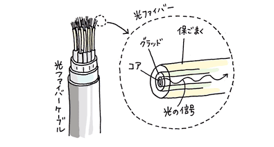 パソコンでインターネットをする時、以前は電話線など、金属(きんぞく)の線を使う方法が一般的だったよ。でも、最近はそういった金属の線に電気を流してデータを運ぶより、もっと速く大きなデータを運べる、光ファイバーという線を使う方法が中心になってきているんだ。