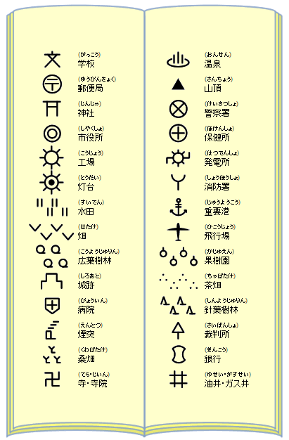 みんなは地図記号をどの位知ってるかな?地図帳を開くと様々(さまざま)な記号が載(の)っているよ。物の形で表わしていたり、文字で表わしていたり、面白い記号がいっぱいだね。