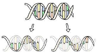 2重のラセン階段を、段の真ん中から分けてやると、反対側にまた同じ相手の部品が作られて、全く同じ2重ラセンができ上がる。こうやって生物の遺伝データはコピーされていくんだ。