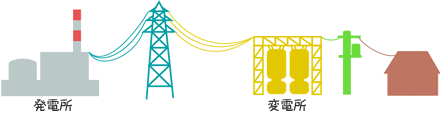 発電所で作られた電気は、送電線を通って次に変電所へ送られる。発電所で作られた電気はそのままでは使えないから、変電所で使いやすい電気に変えているんだ。そして配電線を通って、みんなの家のコンセントまで電気は運(はこ)ばれて行くんだよ。発電所は広い土地とたくさんの水が必要だから、山の中や海の近くにあることが多い。電気は長い旅をして、家までやってくるんだね。