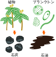石炭、石油、天然ガスは、何億年も前に地球上にいた植物や水中のプランクトンなどの死がいが海や湖の底にたまり、バクテリアなどによって分解(ぶんかい)され、地熱で温められて変化したものだ。地中深くにうもれて、強い力で押(お)さえつけられ、長い年月をかけて植物は石炭になり、プランクトンなどは石油や天然ガスになったんだよ。