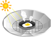 まずはアルミはくなどの金属(きんぞく)板を組み合わせて、大きな鍋(なべ)みたいな装置(そうち)を作る。これがソーラークッカーといって、コンロの代わりになり、太陽の熱を集めるんだ。晴れた日に陽あたりのいいところに置くと、すぐに熱くなるよ。ここへ、熱を吸収(きゅうしゅう)しやすい黒い鍋を置く。油をしいて、卵(たまご)を割(わ)って入れてみよう。次第に卵が焼けて、目玉焼きができあがるよ。ほかにもお茶をわかしたり、イモを焼いたり、いろんな料理を作ってみるといいね。