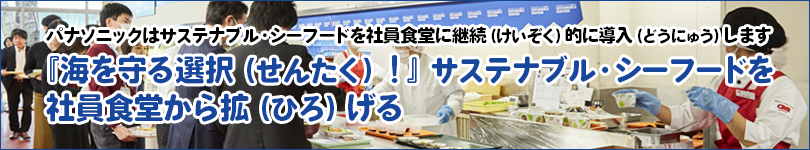 パナソニックでは、社員食堂(しょくどう)にサステナブル・シーフードを