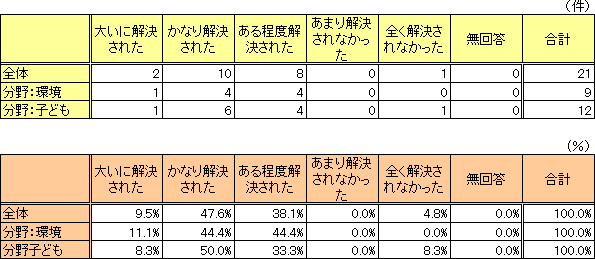 Panasonic NPOサポート ファンドの助成により2010年にキャパシティビルディング事業を行った団体のうち12団体(回答団体の57.1%)が、「助成申請の際に抱えていた組織運営上の最大の課題は、事業を実施することによって解決されましたか?」という問いに対して、「大いに解決された」あるいは「かなり解決された」と回答した。助成によって、半数を超える団体で課題解決が進んでおり、本助成の有効性を示している。