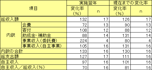 助成前年(2009年)と助成1年後(2011年)の年間総収入を比べた場合、平均して30%の収入の増加が見られた。助成は組織の成長にも寄与したといえる。