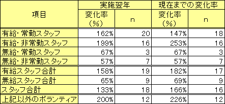 助成先団体の有給スタッフ数は、常勤・非常勤をあわせると、助成実施前と現在とでは平均82%増加した。一方で無給スタッフ数は、常勤・非常勤をあわせると31%減少している。有給スタッフ数が増加傾向にあり、組織運営の体制が整う方向にあるとみられる。