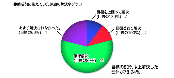 助成前に抱えていた課題が解決されたかどうかという質問に対しては、「目標を上回って解決された(目標の120%)」が2団体、「目標どおり解決された(目標の100%)」が2団体、「ほぼ解決された(目標の80%)」が11団体、「あまり解決されなかった(目標の60%)」が4団体だった。「まったく解決されなかった」団体はなかった。平均すると、目標の達成度合いは82.1%であった。