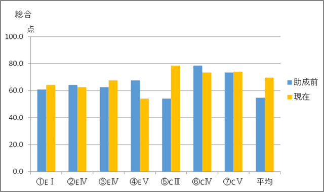変化が最も顕著だった団体(⑤cⅢ)は、助成前が22.2点であったのに対し、現在は51点と、約2.3倍となった。