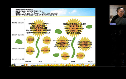 チームふくしまは2011年の東日本大震災を機に、復興支援の団体としてNPO法人化。全国の人に育ててもらったひまわりの種を福島にまく「福島ひまわり里親プロジェクト」や見知らぬ誰かに恩送りをする「お互いさまの街ふくしま」など、複数の事業がそれぞれ活動していて、何をしている団体か簡潔に説明できないのが悩みで、5名のチームで営業資料を作成しました。2023年9月からオンラインで団体の方10名にヒアリングし、約20名にアンケートを実施。これをもとに営業資料では、それぞれの事業が立ち上がった経緯と理念、事業に参加する方法を紹介しました。さらに、事業がどのような広がりを見せているかマップで示し、参加者やボランティアがどんな思いで取り組んでいるか声を集め、ばらばらになっているホームページをリンク集としてまとめました。能登半島地震の被災地で復興支援をしている理事長さんからは「この資料のおかげで、どんな団体か説明でき、安心して受け入れてもらえた」との評価をいただきました。送った恩が循環していく活動であることを実感しました。