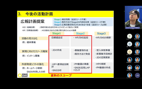 イカオ・アコはフィリピンを拠点に、マングローブの植林など、環境事業の推進に取り組んできた団体ですが、新規ステークホルダーの獲得と活動サポーターとの協業による事業確立が課題でした。そこで私たちのチームは5人で、広報活動を通して、この2つを実現する事業計画を立案しました。初めに、団体関係者に活動内容や広報に関するヒアリングを行ったところ、次のアクションにつながる発信ができていないことがわかりました。そこで、消費者の行動のプロセスを表す「AISAS」に沿って、SNSやホームページ、LINEなどを活用し、寄付やボランティア、インターンシップといった実際の行動につなげる流れを提案しました。さらに、団体の情報を見てくれる人を増やすために、大中小のテーマごとにハッシュタグをつける方法や、投稿後のリアクションを見て、継続的に発信内容を改善していく必要性についてもお伝えしました。イカオ・アコさんには、「職員が3人しかいないので、もともと使っているInstagramやFacebookを中心に、効率的に広報活動ができる方法を提案していただき、とても助かった。すでに活用を始めている」と、喜んでいただけました。