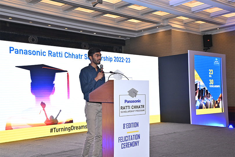 2022年パナソニック スカラシップ アジア セレモニー - 自らの体験を共有するShivomさん。