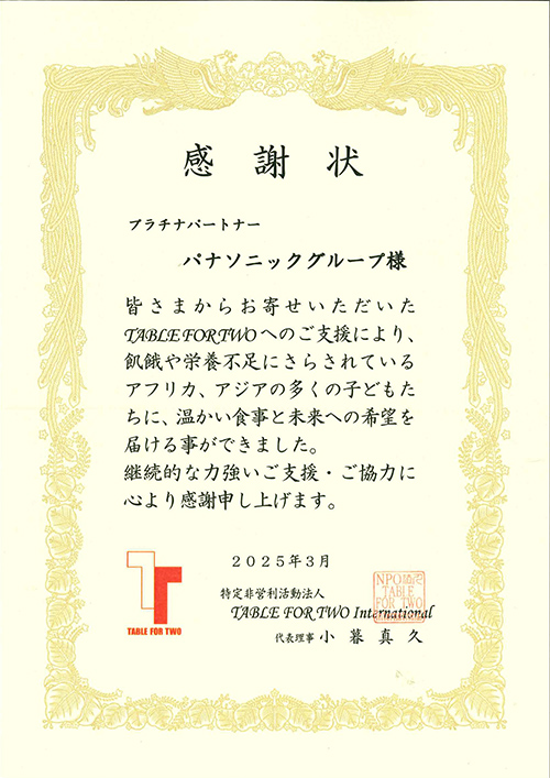 パナソニックグループでは、日本国内では、2024年の1年間で子どもたちの給食71,205食に相当する約142万円の寄付を行いました。