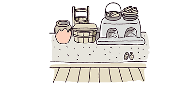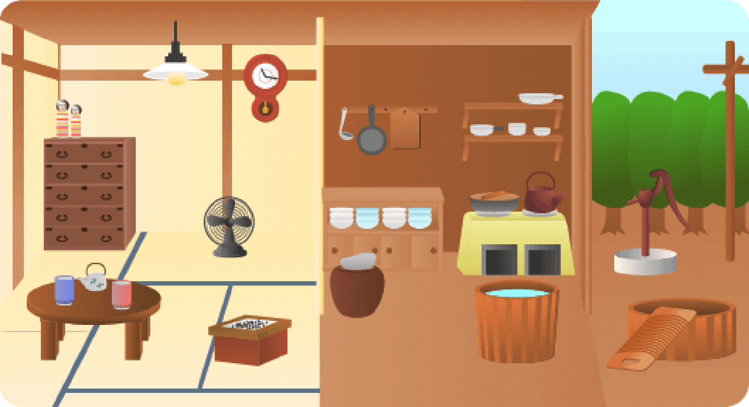 電気やガスがまだ家に届(とど)いていないこの時代、火を使う料理はコンロではなく「かまど」を使っていた。「かまど」は、中でまきや炭を燃(も)やすので、すすや煙(けむり)がいっぱい出る。だから台所は居間(いま=リビング)から離(はな)れているのが当たり前だった。水道もないので、「井戸(いど)」からくんできた水をためておくための大きな「水がめ」や、水がめから水をくむための「手おけ」など、今では見ることのない道具がいっぱいあったんだ。