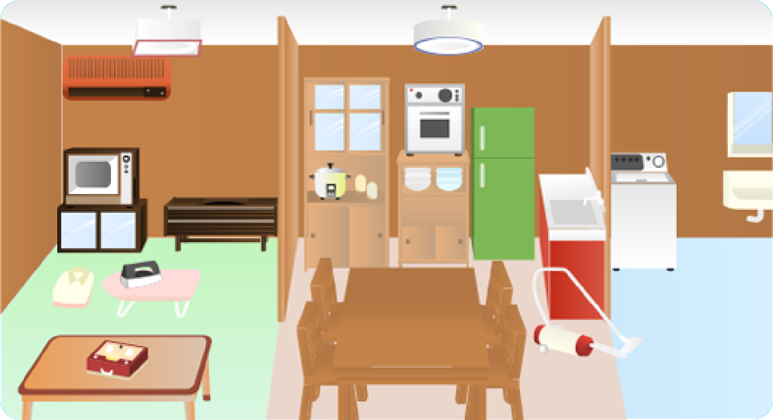 1950年ごろ、日本人はアメリカのテレビ番組を見て、大きな電気冷蔵庫(でんきれいぞうこ)にびっくりしていた。ようやくこの時代になると冷蔵庫は96%(パーセント)の家庭にあるようになったよ。形もドアが1つの物から、ドアが2つ、つまり冷凍庫(れいとうこ)のついた大型の物が増(ふ)えていった。また電子レンジや電子ジャー、自動食器洗(あら)い機、電気もちつき機などの新しい台所用品もどんどん発売された。お母さんの家事がずいぶんと楽になってきたんだ。