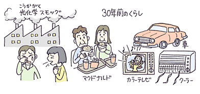 1970年ごろ、日本は「高度成長期」といわれる時代で、私(わたし)たちの生活にも大きな変化が表れた。みんなにもおなじみの「マクドナルド」もこの時代に生まれたんだ。また工業が発展(はってん)するのに伴(とも)なって、「光化学スモッグ」などの公害問題も起こるようになってきた。身近な暮らしでは、家の中の電化製品(でんかせいひん)がますます増(ふ)え、今の生活に欠かせないような家電製品は一通 り買うことができるようになった。また「カラーテレビ」「クーラー」「車(カー)」は「3C」と呼(よ)ばれてみんなが持ちたいと思う商品の代表だったそうだ。