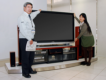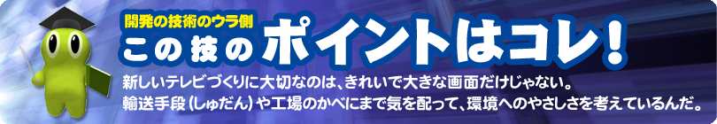 迫力(はくりょく)のある美しい画面、すっきりしたうす型はもちろんのこと、年を追うごとに素材(そざい)や部品を見直して画面が大きくても値段(ねだん)や、電気代を安くする工夫がされているよ。