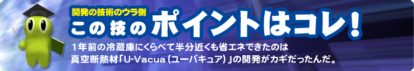 それを実現(じつげん)したのはノンフロン高効率(こうこうりつ)コンプレッサーと、何よりも画期的な真空断熱材(だんねつざい)の開発なんだよ。