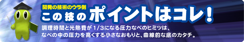 圧力だけでなく、熱効率(ねつこうりつ)を良くする曲線的な底のカタチにもこだわりがあるよ。