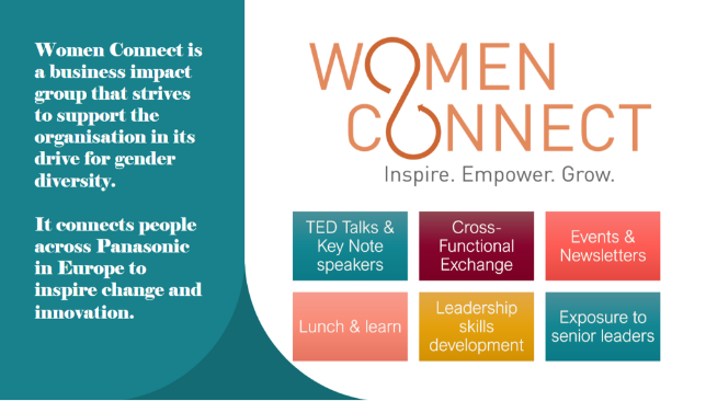 PEは、ジェンダー平等を強化し、人材プログラム以外の手法で女性社員のキャリアをサポートするために、2021年にビジネス・インパクト・グループ「Women Connect Europe」を設立しました。現在、30カ国のパナソニック企業31社にわたる約350人が同グループのネットワークに参加しています。