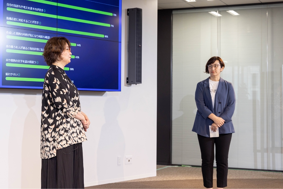 「発達障がいがあることを打ち明けてみたら、仕事内容は変わる?」「社内独自の用語によるすれ違い」といった、実際の業務上で起こり得るシチュエーションをベースに、ロールプレイを展開。視聴者もオンラインでアンケートに答え、リアルタイムでその結果が共有されるなど、インタラクティブな要素も盛り込まれたセッションとなりました。