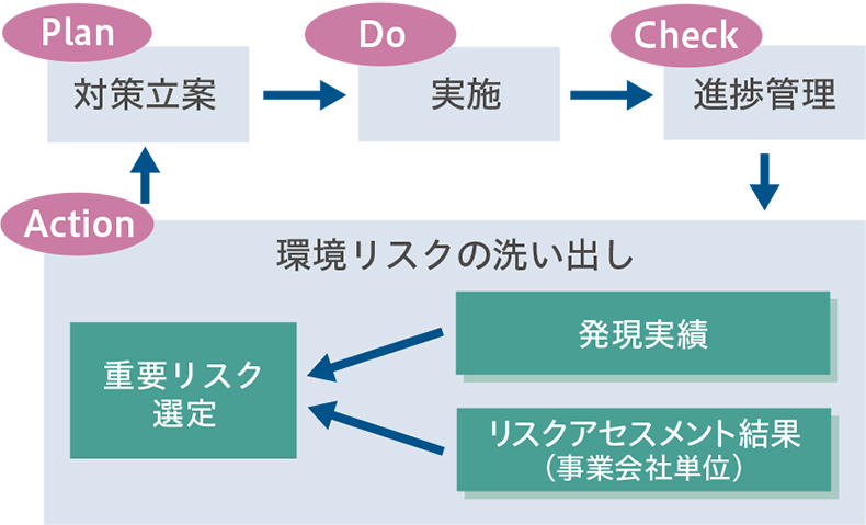 環境リスクの洗い出しとマネジメント推進を図るために、事業会社単位で対象とする環境リスクを毎年度選定し、そこからさらにグループ全社レベルの環境リスクを選定しています。その中でも特に発生頻度が高いまたは経営への影響が大きいリスクを重要リスクとして特定し、重点的にリスク低減対策を立案・実践しています。重要リスク単位でリスク低減取り組みを進めますが、その進捗は四半期ごとに確認・フォローしながらPDCAサイクルを回します。