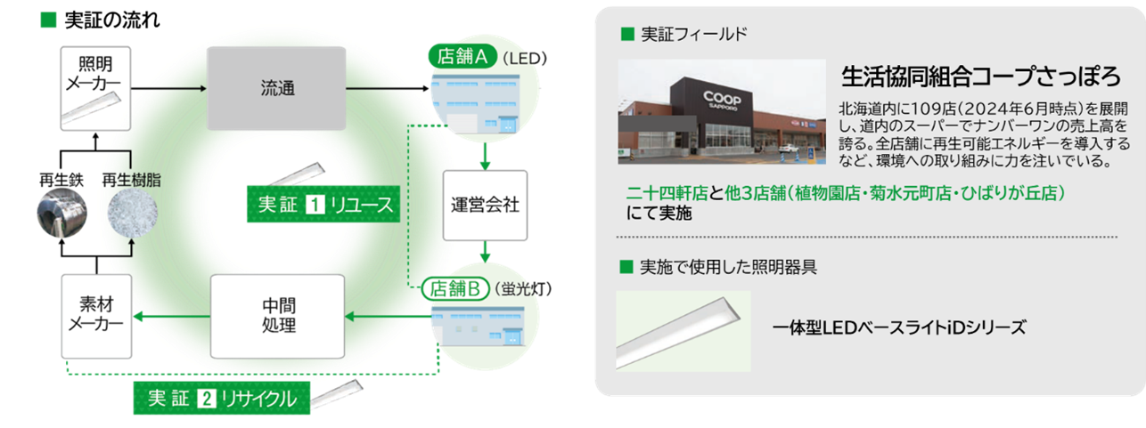 当社グループは、環境省の実証事業を活用し、店舗Aバックヤードで使用しているLED照明器具に遠隔センサーを搭載、状態のモニタリングをおこないながら、店舗Bバックヤードの蛍光灯と交換して使用するとともに、取り外した蛍光灯については部品や部材に分け、リサイクルに回すという実証実験を4社の実証パートナー様および6社の協力企業様とで行いました。さらに、NFT(ブロックチェーン技術によって管理される電子証書)を活用し、原材料の調達から製品の使用、そして新たな照明器具として再利用されるまでのプロセスを追跡・証明する取り組みにも挑戦しています。店舗やオフィスの改修時には、照明器具の状態を確認せずに廃棄されるケースが少なくありません。一方、発売から約10年が経過したLED照明器具ですが、市場では依然として約半数が蛍光灯を使用しているのが現状です。当社グループは、LED照明器具のリユースを通じて、お客様の照明コストを大幅に削減するとともに、寿命末期を迎えた照明器具を素材として工場に戻す水平リサイクルにも取り組んでいます。今回の実証実験で得られた成果は、照明の機能提供型サービスのオプションとして提案し、早期のサービス運用開始を目指しています。