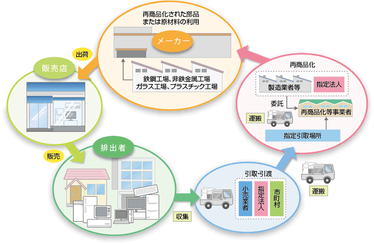 家庭の中にあるたくさんの家電製品。 捨ててしまえばそれは「ゴミ」ですが、正しく廃棄すれば「資源」としてもう一度役立てることができます。 だから、使った人も売った人も作った人も、みんなが協力し合うことが必要なのです。