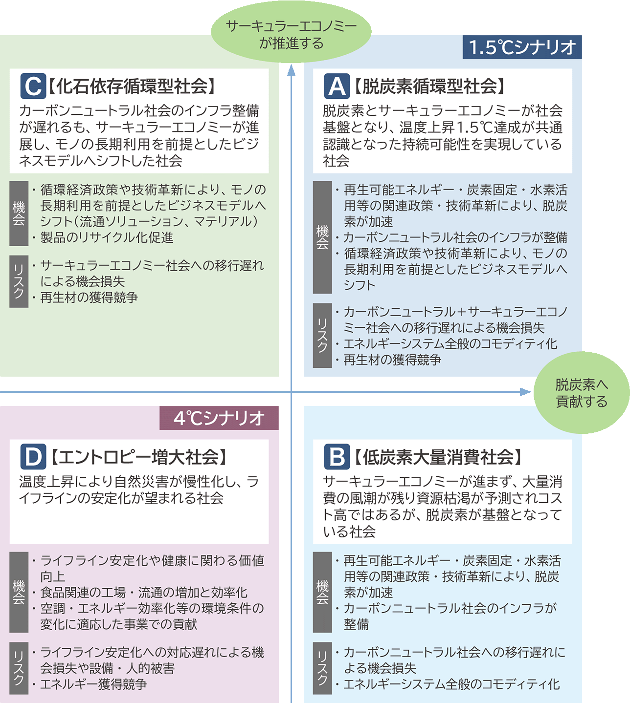 シナリオ分析の結果、4つのシナリオのどの社会が実現しても、当社グループのいずれかの事業が対応可能であり、当社グループ戦略のレジリエンスが検証できました。また、当社グループは事業を通じて、社会全体のサステナビリティ実現に大きく貢献することができ、(Aで示す)1.5℃シナリオで想定される社会を目指していきます。