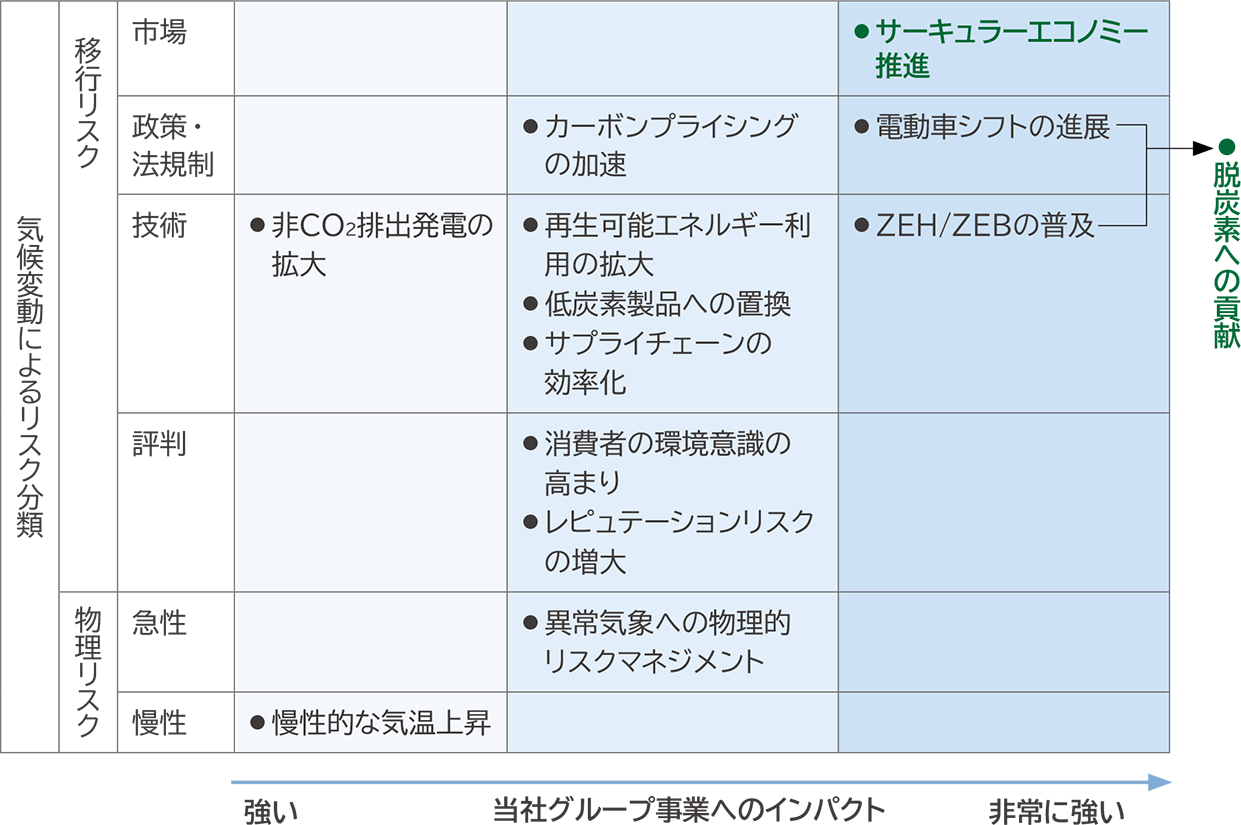 | 評判 | 消費者の環境意識の高まり | ・環境取り組みと訴求の不足による不支持 ・所有から使用への価値観変化による販売減 | ・サステナブル企業、製品と認知されることによる顧客増 ・低炭素製品、エコマテリアル、エネルギーマネジメント事業の拡大 | |