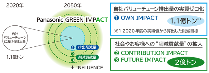 現在、この使命達成を阻む最大の課題は、地球環境問題です。中でも、喫緊の課題である気候変動と、限りある資源の枯渇を少しでも食い止めるためには、2050年頃までにカーボンニュートラル社会を実現(気温上昇を1.5℃に抑制)すること、そして資源循環型の経済システムを実現することが不可欠です。当社は、これらの課題に対して企業としての責務を果たすとともに、社会やお客様への貢献に向けていち早く行動(ACT)し、より大きなお役立ちを果たすことで、必ずや解決に導くという強い決意のもと、2022年1月に長期環境ビジョン「Panasonic GREEN IMPACT(PGI)」を発表しました。