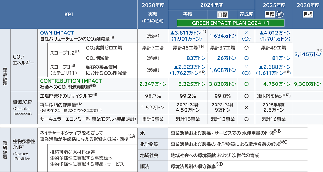 GIP2024では、重点課題に対するKPI※7として、OWN IMPACT、CO2実質ゼロ工場の数、CONTRIBUTION IMPACT、工場廃棄物のリサイクル率、再生樹脂の使用拡大、新規サーキュラーエコノミー型事業モデルの創出を設定しています。