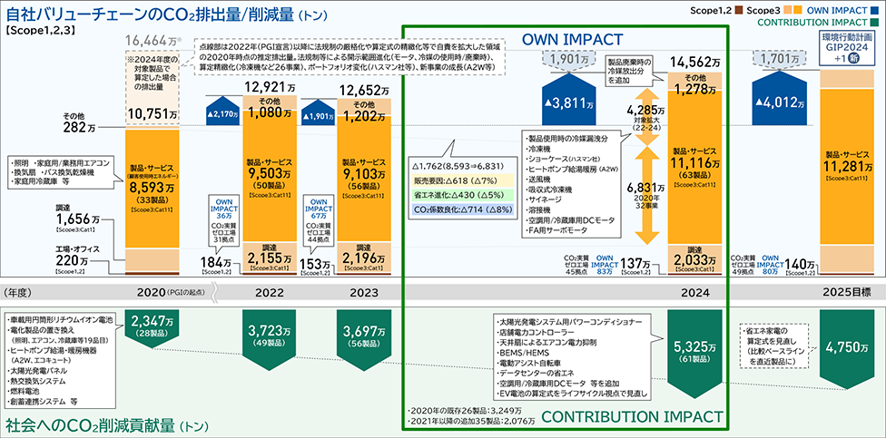 2024年度の製品・サービスによるCO2削減貢献量(CONTRIBUTION IMPACT)は5,325万トンとなり、目標値である3,830万トンに対して1,495万トンの大幅な達成を果たしました。この達成の主な要因は、脱炭素に貢献する各事業の拡大に加えて、新たに空調用および冷蔵庫用のDCモータ、データセンター向け分散型電源ソリューションを対象に加えたことによるものです。対象製品数は、2020年度の28製品から2024年度には61製品へと拡大しています。