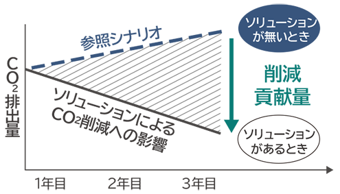 削減貢献量は、あるソリューションによるCO2削減への影響を、そのソリューションが使用されない参照シナリオと比較したときの、社会に対するプラスの影響と定義される