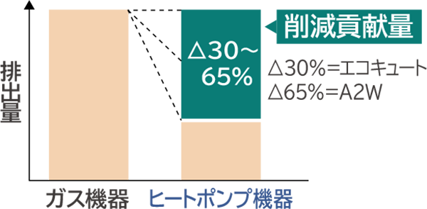 市場に普及している平均的なガス燃焼式の給湯・暖房機器と比べて、同量の能力を持つ本機器がヒートポンプで熱交換することで、生涯で使用する電気のCO2排出量が少なくなる。