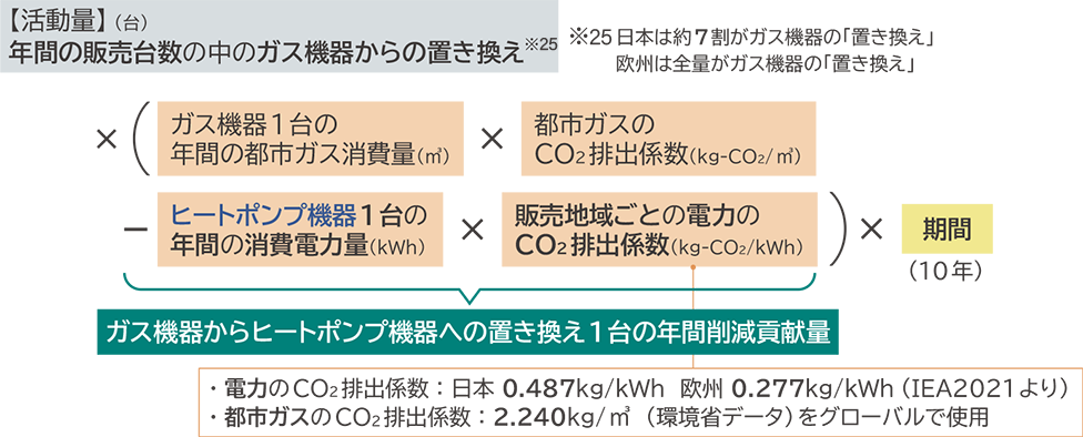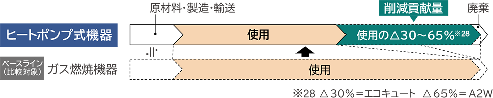 機器の使用時。ヒートポンプ機器とガス機器ともにCFP*が対象で、使用時以外のCFPもHP機器の方が優位だが、使用時のCFPの差分と比較して小さく※27、保守的に数値化する観点から削減貢献量に加算しないと判断。