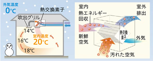 換気時に熱交換素子で室内外の熱を交換して、室内に送り込む空気の温度をあらかじめ冷やす/温めることで冷暖房負荷を低減し、さらに空気清浄も付与した高機能システムであり、高い気密性が求められる日米欧や中国などの住宅や店舗、ビルなどで幅広く利用可能。