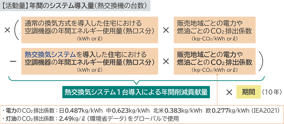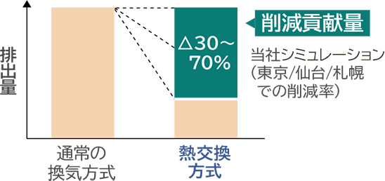 通常の換気方式と熱交換方式における居住空間の空調機器の運転で消費されるエネルギー量の差分に、販売地域ごとの電力や燃油※36のCO2排出係数を乗じる。