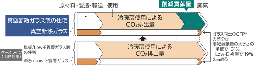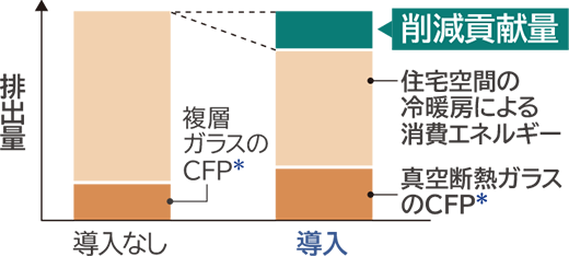 真空断熱ガラスの導入有無による住宅の冷暖房エネルギーのCO2排出量とガラスのCFP*の比較