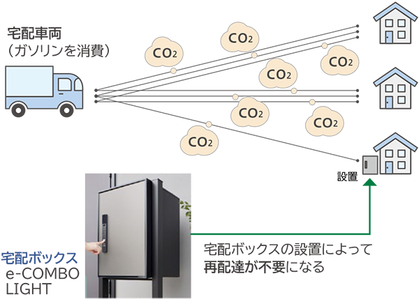 家庭に宅配ボックスを設置することで、再配達が回避され、荷物を受け取る人の煩わしさの解消や宅配事業者の労働時間短縮と、同時に、配達にかかる車の燃料等のエネルギーの消費に伴うCO2排出量が削減され、地域物流網の負荷量軽減と低炭素化に貢献する。