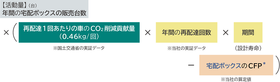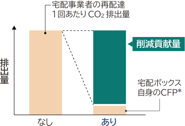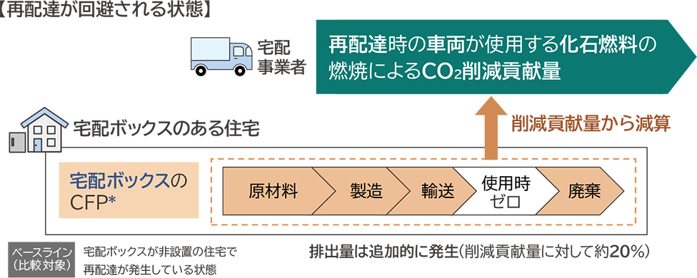宅配ボックスは使用時の排出量はゼロだが、CFP*全体では削減貢献量に対して20%(当社試算)あり、これは追加的な影響であるため削減貢献量より減ずる。