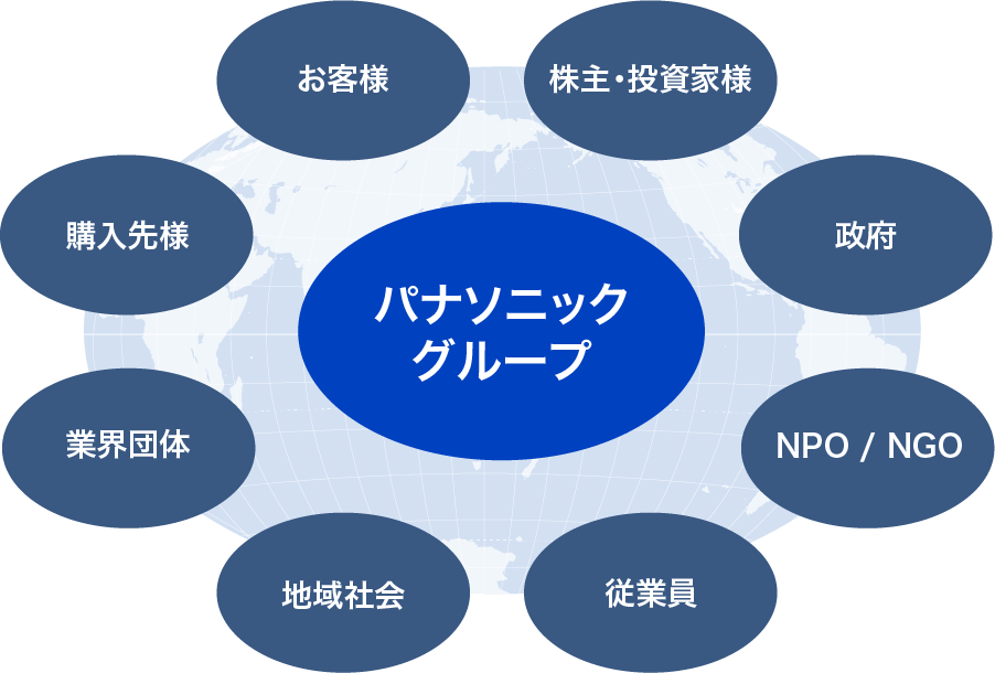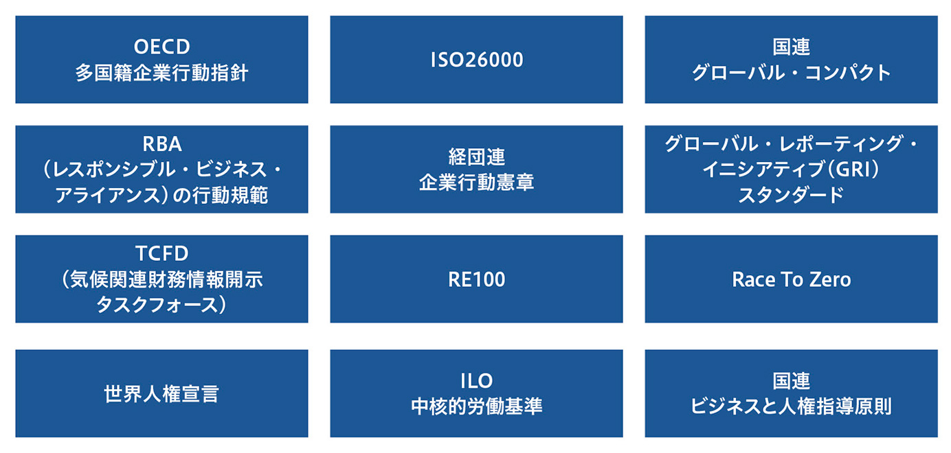 当社グループは、適用される法令の順守に加え、以下のグローバルスタンダードの規格や規範、ガイドライン、各種イニシアティブを踏まえて、事業を展開しています。これらの考え方は、事業活動の指針となる「経営基本方針」「パナソニックグループ コンプライアンス行動基準」にも反映しています。